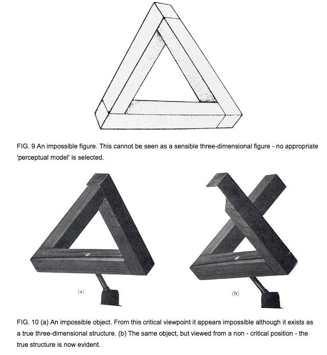 The impossible triangle was traditionally presented as a 2-D drawing of an imagined 3-D figure. Gregory: “The impossible triangle (FIG. 9) (L. S. Penrose and R. Penrose 1958) cannot be seen as an object lying in normal three-dimensional space.” But Gregory presents us with a 3-D model that can be perceived as the impossible triangle from certain positions. We’ll get back to that perception and how it relates to the illusion of consciousness. This is the model used by Nicholas in the RI video.