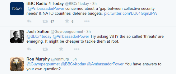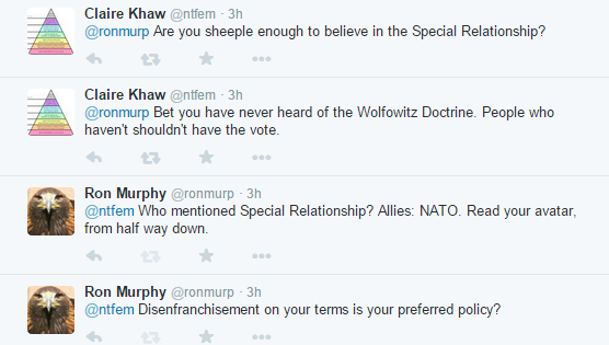 So, I asked why an ally (in NATO) would attack us for not spending enough on defence, Claire brings up Special Relationship – old defunct US/UK thing, not NATO ally thing. So when I ask, “who mentioned S.R.”, I ask it rhetorically to mean why did she bring it up, because I didn’t, and it isn’t pertinent. I suggests she read her own avatar to see what it says about, well, bullshitting.