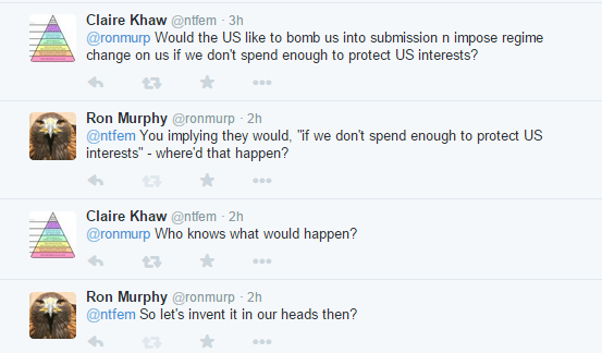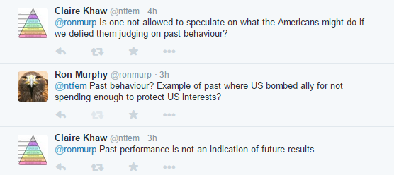 That first one? The US, will bomb an ally, for what, lowering our defence budget or something? Do you get the idea that Claire has conflated forcing regime change in in Iraq in the mistaken view that it would be for the better with no hitches, for wanting an ally to contribute to our collective defence needs?
