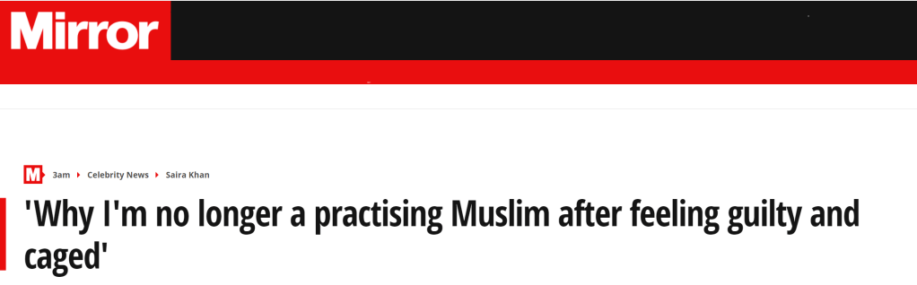 So, if Saira wants to be honest it’s not just a matter the honesty about one’s own identity that needs to be established; a little more honesty about Islam is needed too. But no, it seems not hurting ‘others of the Muslim faith’ seems the greater concern, and not the harm done by SOME (too large a number) of the Muslim faith, by action or omission.