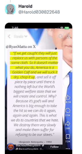 The quote attributed to Benjamin Netanyahu—about “America as a Golden Calf” to be “sucked dry” and dismantled—is not authentic. There is no credible record, transcript, interview, or archival source from 1990 (or any other time) in which Netanyahu said anything like this. The wording itself contains clear red flags: broken English inconsistent with his fluent, native-level English; sweeping, conspiratorial language; and themes (“we will destroy countries slowly,” “control welfare states”) that do not appear in any verified speeches or writings. This quote circulates primarily on social media and in meme form, without traceable sourcing, which is a strong indicator of fabrication.