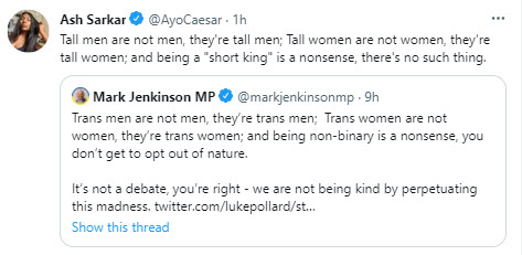 Ash’s use of “Tall men are not men they are tall men” is specifically trying to point out what she thinks a rediculous claim by Jenkinson, “Transwomen are not women they are transwomen”. But that relies on Ash’s false presupposition that Transwomen are women. Jenkinson is right, transwomen are not women (they are not a subset of women), they are transwomen (a subset of men).