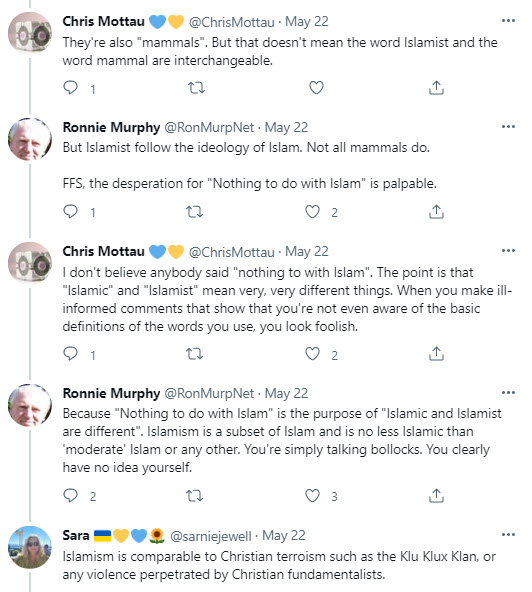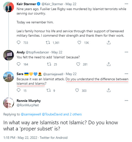 Here is an exchange on Twitter that shows that Sara might not know what a proper subset is – or that she really thinks being Islamic and being an Islamist are mutually exclusive: