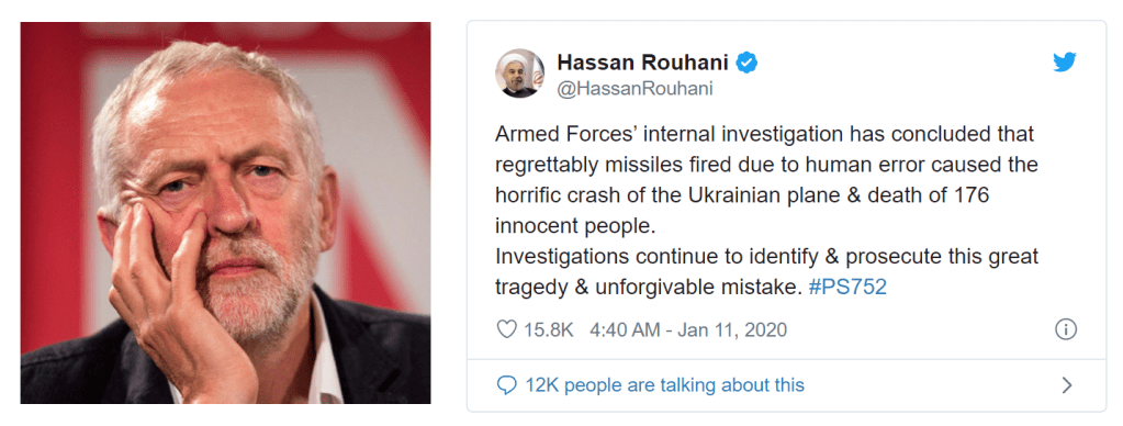 In Iran on the 7th, at the contrived burial procession for Soleimani, the state killed at least 56 people and injured over 200. Nothing from Jeremy? You’d think he’d show sorrow for such a loss of life, as he usually does. However, this is a diplomatic nightmare for Jezbollah, star of Iranian state TV, well wisher of the homecoming of a ‘brother’ terrorist’s return to Iran.